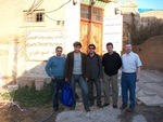Color, staged photo of EIU professor Mark Grunhagen (rightmost) and locals in front of the Kuraish Textile Museum. The museum that the group in standing in front of is made of light-colored brick and has large wooden doors.