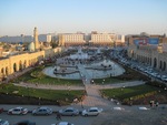 Color photo of Erbil, Iraq. There is a large fountain in the middle of the space with greenery surrounding it. Surrounding this are tall buildings and structures.