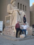 Color, posed photo of two Eastern Illinois University professors in front of a large statue in Erbil, Iraq. Professor Flight is standing on the left and is wearing a red long-sleeved button down and black slacks. Professor Grunhagen is standing on the right and is wearing a short-sleeve button down and blue jeans. They are standing in front of the Statue of Zoroaster, which depicts a man sitting with a book in his lap.