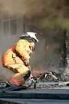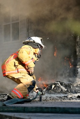 Canid, color photo of a firefighter controlling the fire at 956 Polk Avenue. The firefighter is seen from the back wearing a fireproof, brown suit with reflective stripes. He is wearing a white, hard firefighter helmet. He is standing in front of a house on fire.
