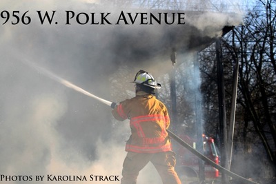 Candid, color photo of a firefighter spraying water from a firehouse into smoke and fire. They are facing away from the camera and are seen wearing a brown firefighter uniform with orange reflective stripes and a white firefighter helmet. There are trees and a fire engine in the background. There is black text over the photo reading "956 W. Polk Avenue - Photos by Karolina Strack".