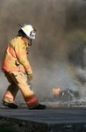 Candid, color photo of a firefighter in mid stride on scene at the 956 Polk Avenue fire. They are seen wearing a brown firefighter uniform and are wearing a white firefighter helmet on their head. The helmet has the number 302 on the front. In the background of the photo, there is a small fire and smoke.