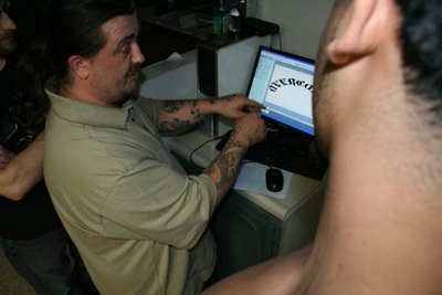 Tattoo artist showing a rendering of a design to the person receiving tattoo. The person receiving the tattoo is seen in the foreground of the photo facing the tattoo artist.