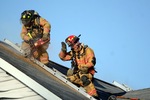 Color, candid photo of two firefighters on the roof. They are kneeling on a silver ladder. They both have on brown firefighter uniforms with orange reflective stripes. The man on the lower rung of the ladder has on a red firefighter helmet and is blocking his eye with his gloved hand. The man on the higher rung is wearing a black firefighter helmet and is using a red chainsaw.
