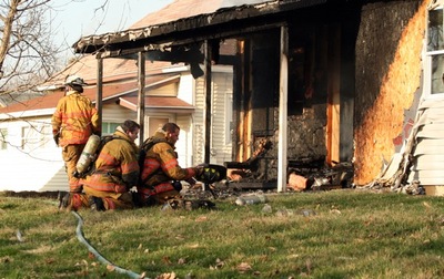 Color, candid photo of three firefighters outside of the remains from the fire at 956 Polk Avenue. Two firefighters are kneeling outside of the remains. They both have on brown firefighter uniforms with orange reflective stripes. The man in front has his black firefighter helmet in his hand and the man behind him has an oxygen tank on his back. The third firefighter is walking away from the camera. He is wearing a brown firefighter uniform with orange reflective stripes and has a white firefighter helmet on his head.