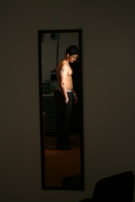 Candid, color photo of the tattoo receiver. They are seen from the side in a full-length mirror shirtless with black pants.