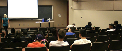 Candid, color photo of students sitting in a lecture hall for a Six-Pack alcohol awareness event. The photo is taken from the back of the hall. There are students in multiple rows and a projector at the front of the hall.