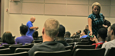 Candid, color photo of a male and female instructor handing out green slips of paper for an activity at a Six-Pack alcohol awareness meeting. The female instructor is wearing a blue plaid shirt and black pants. The male instructor is wearing a blue shirt and blue shorts. There are students sitting throughout the lecture hall.