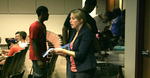 Candid, color photo of a woman handing out blue tickets at a Six-Pack alcohol awareness meeting. She is wearing a pink shirt, a black blazer, and black pants. Behind her are students signing a paper. There are also some students sitting in the lecture hall chairs.