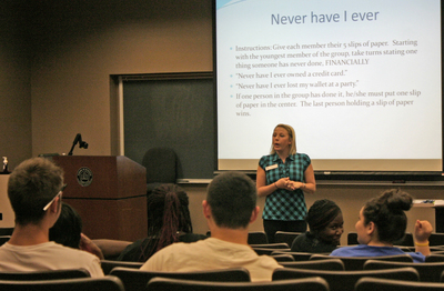 Candid, color photo of a Six-Pack meeting. The photo is taken from the back of the lecture hall. Students are seen sitting within the seats of the room. At the front of the room is a female instructor. She is wearing and blue plaid shirt and black pants. Behind her is a project screen that reads "Never have I ever" and has written instructions for an activity for the students.