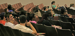 Candid, color photo of students at a Six-Pack alcohol awareness meeting. The students are shown from the side, and they are seated throughout the lecture hall. Some students are holding a green piece of paper in their hands.