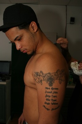 Color, candid photo of the tattoo receiver getting the stencil placed on their back. They are shown waist up, shirtless wearing a black baseball cap on their head. They have tattoos on their outer bicep.