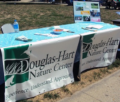 Candid, color photo of a table representing the Douglas-Hart Nature Center at the volunteer fair. The table is covered with a blue tablecloth and has two posters hanging that are advertising the organization. There is a another poster standing up behind the table.