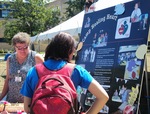 Candid, color photo of a person at the volunteer fair looking at the poster for the Camp Healing Heart organization. The poster is decorated with photos of volunteers and information about the organization. The person looking at the poster is wearing a blue shirt and has a red backpack. There is also a woman manning the fair booth. She is wearing a patterned, sleeveless shirt.