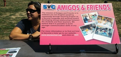 Candid, color photo of a woman sitting at a table behind a sign. The sign is advertising "Amigos & Friends" as a volunteering opportunity. The sign is pink and has photos of people volunteering on it. The sign also has information about the group and has instructions for further information. The woman manning the table is wearing sunglasses and a navy-blue top. She is looking away from the camera.