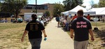Candid, color photo of two attendees at the Volunteer Fair. They are seen from the back walking towards the white tents for organizations at the fair. The woman on the left has on black shirt and jeans. The man on the right has on a black shirt and grey pants.