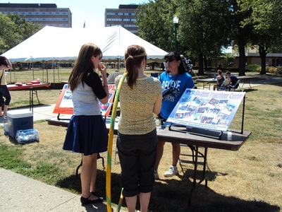 Candid, color photo of two students talking to a representative from the Student Volunteer Center at the Volunteer Fair. The woman running the table is wearing a blue shirt and sunglasses. The student on the left is wearing a grey and black shirt and a skirt. The student on the right is wearing a yellow shirt and black pants. There is a poster on the table advertising photos of volunteers from the organization.