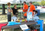 Candid, color photos of volunteers at the Special Olympics table at the Volunteer Fair. There are four people talking to each other behind the table. There is also a woman talking on the phone. There are freebies and t-shirts on the table.