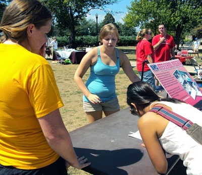 Candid, color photo of students at a volunteer organization's table. On the table is a pink sign that reads "After School Program". One female student is signing a paper on the table and two other female students are standing with her.