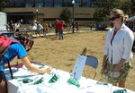 Candid, color photo of a student signing a piece of paper at a volunteer organization's table at the Volunteer Fair. The student is wearing a blue shirt, black shorts, and a red backpack. The woman manning the table is wearing a white shirt, a green printed skirt, and black sunglasses.