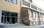 Color photo of the alternative entrance to McAfee Gymnasium on the Eastern Illinois University campus. The building is composed of brick and concrete fixtures. There are steps and handrails leading up to the double door entrance.