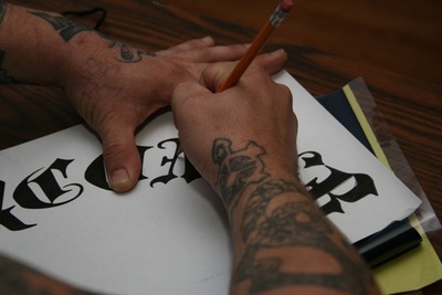 Colored photo of a tattoo artist drawing a stencil. Their arms and hands are shown, and they are tattooed. The artist is holding a pencil in their hand.