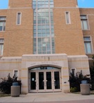 Color photo of the front of the Mary J. Booth Library on Eastern Illinois University campus. The building is tan in color and has many windows on the front of the building.