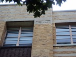 Color, close up photo of a motif of a dinosaur on the exterior of the Physical Science Building on the Eastern Illinois University campus. The building is made of tan brick and concrete.