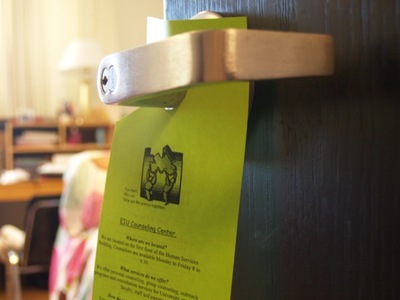 Color photo of a lime green, printed door hanger that is advertising the EIU Counseling Center.