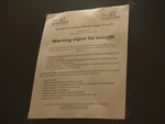 Color, close up photo of a printed poster that has warning signs for suicide printed on it.