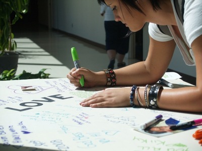 Candid, color close up photo of a student writing on the Suicide Prevention Week poster. They are holding a green sharpie in their hand. They have black, short hair and are wearing a white t shirt and multiple bracelets.